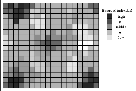 The local model (diffusion model) handles every individual separately and selects the mating partner in a local neighbourhood by local selection, see Section 3.4. Thus, a diffusion of information through the population takes place. During the search virtual islands, see figure will evolve.
