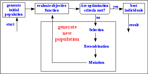 If the optimization criteria are not met the creation of a new generation starts. Individuals are selected according to their fitness for the production of offspring. Parents are recombined to produce offspring. All offspring will be mutated with a certain probability. The fitness of the offspring is then computed. The offspring are inserted into the population replacing the parents, producing a new generation. This cycle is performed until the optimization criteria are reached.